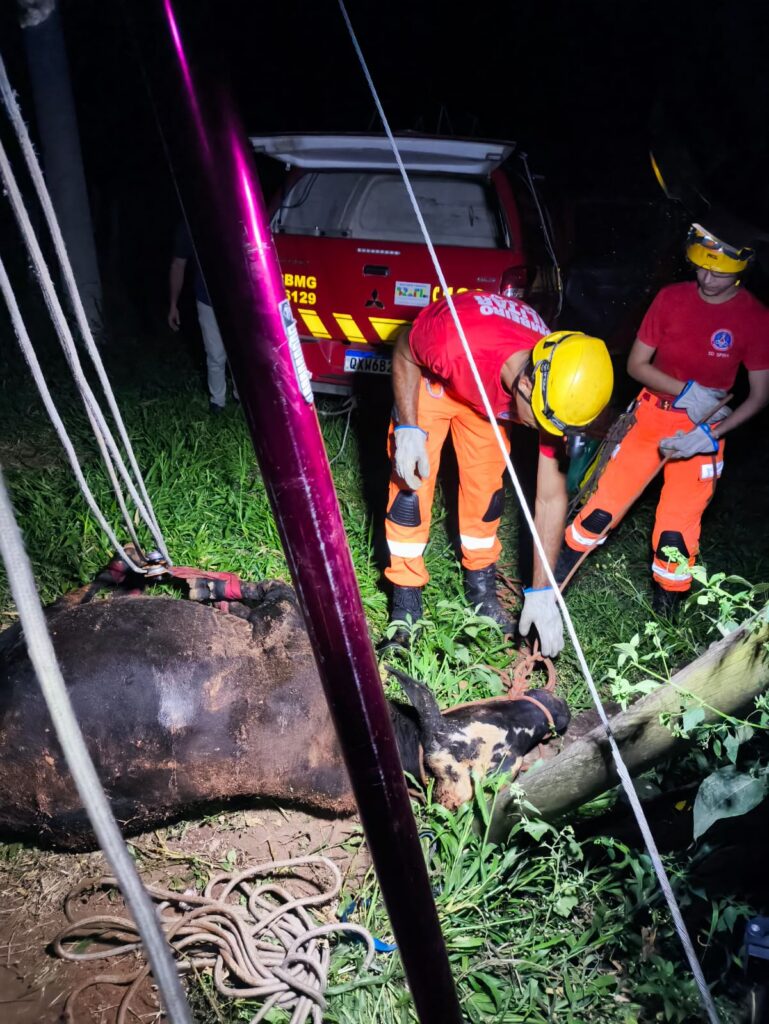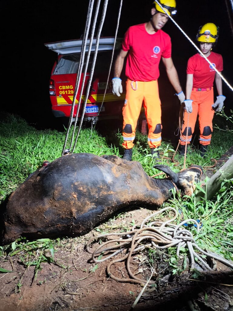 Um bovino foi resgatado pelo Corpo de Bombeiros após cair em uma fossa de aproximadamente cinco metros de profundidade, na tarde desta quarta-feira (1º), no bairro Comunheira Jouberte, em Córrego Fundo.