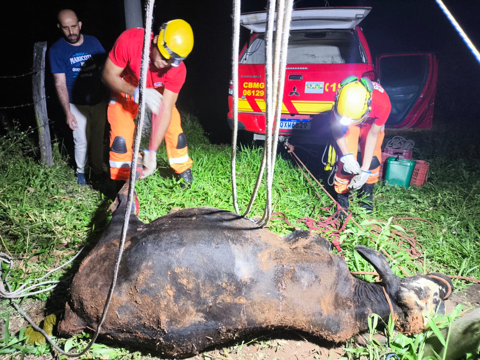 Para realizar o salvamento, a equipe montou um sistema com técnicas específicas, utilizando tripé e sistema de vantagem mecânica, o que permitiu o acesso seguro ao interior da fossa e a amarração adequada do bovino.