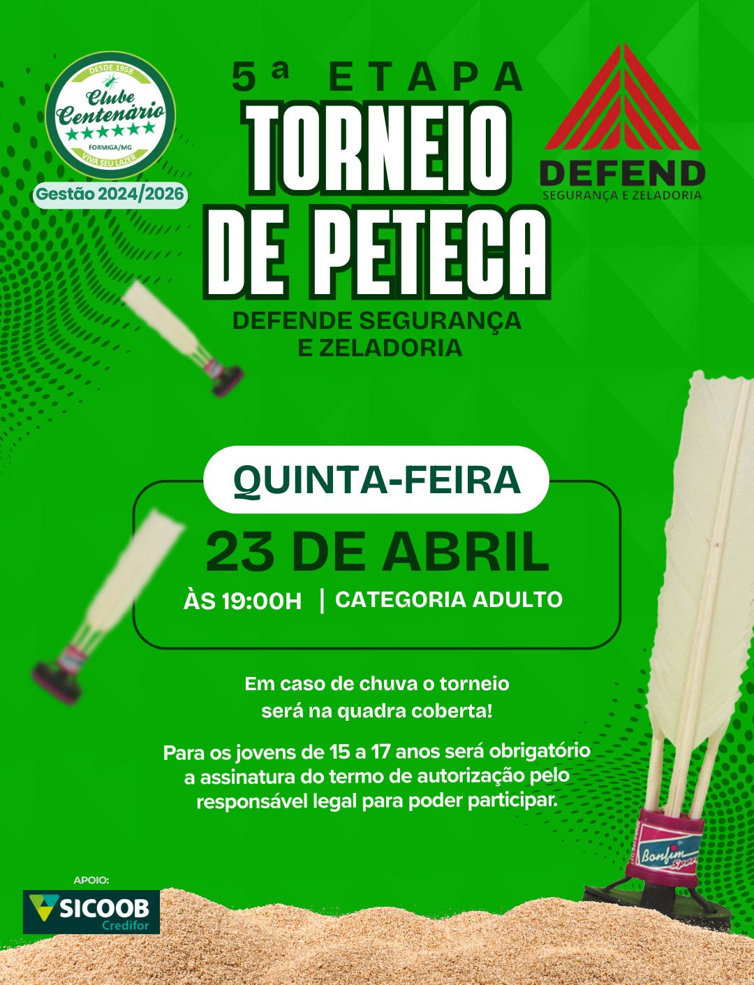 O esporte local ganha destaque nesta quinta-feira, 23 de abril, com a realização da 5ª Etapa do Torneio de Peteca Defende Segurança e Zeladoria. O evento, organizado pelo Clube Centenário (Gestão 2024/2026), reafirma o compromisso da instituição com o lazer e a prática esportiva na região de Formiga.