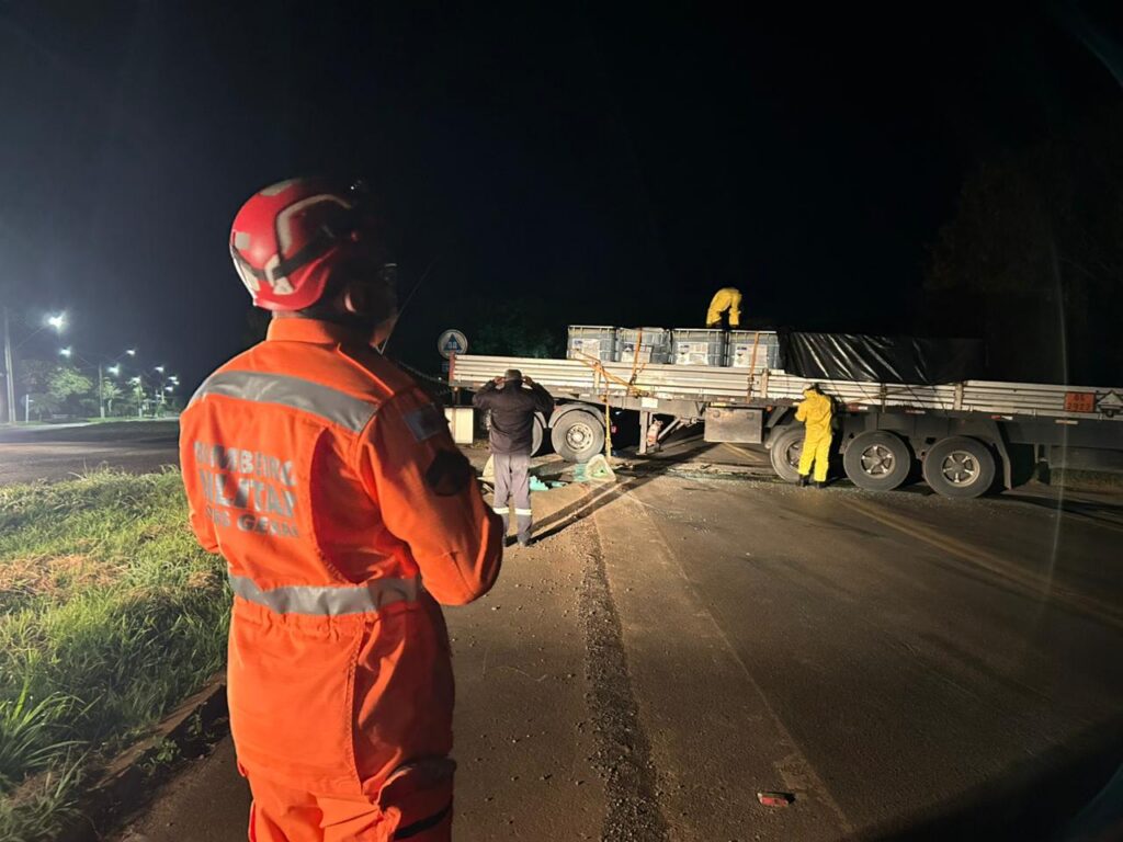 Um vazamento de produto químico foi registrado após um acidente envolvendo uma carreta e um caminhão na noite dessa segunda-feira (6), na BR-354, na altura do km 418, no trevo de acesso a Bambuí.