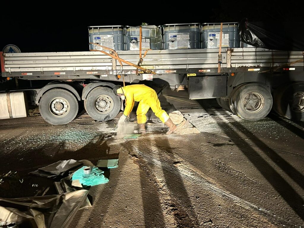 De acordo com o Corpo de Bombeiros, a carreta transportava um líquido corrosivo e tóxico, armazenado em 13 bombonas com capacidade de mil litros cada. Com o impacto da colisão, uma das embalagens foi danificada, provocando o derramamento de parte do produto na pista.