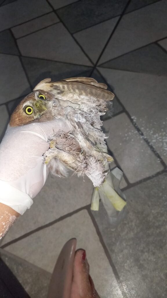 Coruja é resgatada após ficar presa em armadilha para roedores em Itapecerica