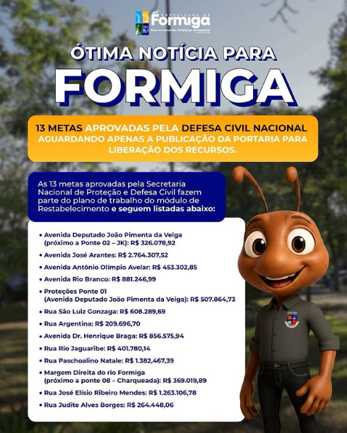 Na última terça-feira, 31 de março de 2026, a Prefeitura de Formiga, por meio da Secretaria Municipal de Obras e Trânsito e da Defesa Civil Municipal, anunciou que 13 metas do plano de restabelecimento da cidade foram aprovadas pela Secretaria Nacional de Proteção e Defesa Civil. Essas ações são fundamentais para a recuperação de áreas atingidas pelas fortes chuvas que afetaram o município.