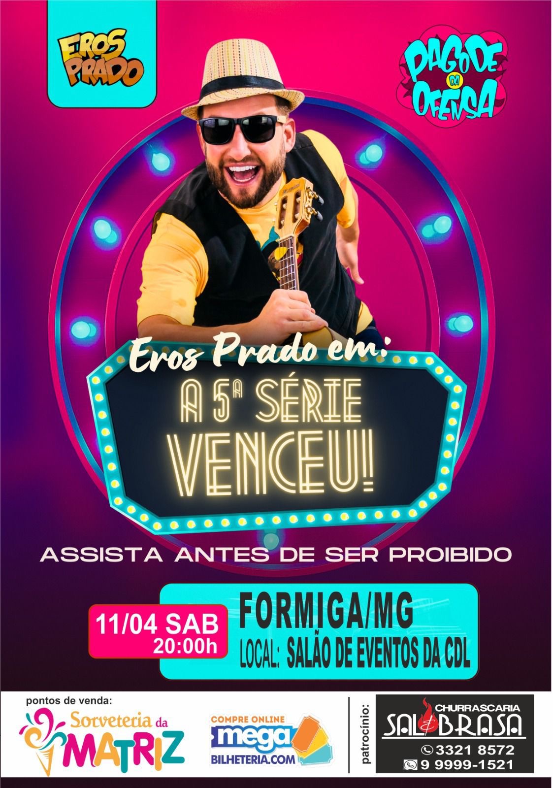 O humorista Eros Prado se apresenta em Formiga (MG) neste sábado, 11 de abril, às 20h, com o espetáculo “A 5ª Série Venceu!!”, do projeto “Pagode da Ofensa”. A apresentação será realizada no Salão de Eventos da CDL.