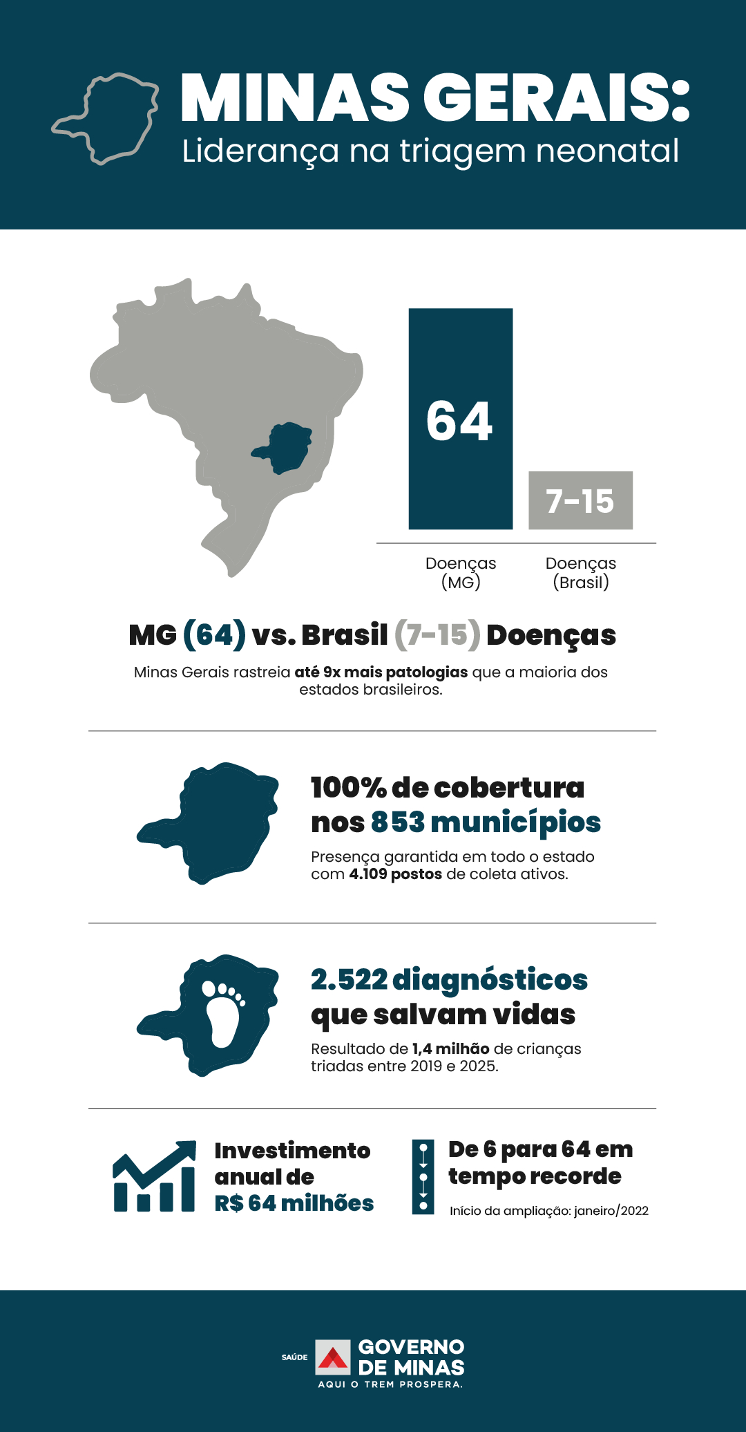 Ao antecipar as etapas da Lei Federal nº 14.154/2021, o Governo de Minas se consolida como referência nacional na ampliação da triagem neonatal. Enquanto grande parte dos estados ainda avança de forma gradual, Minas já garante acesso universal ao exame ampliado em todo o território.
