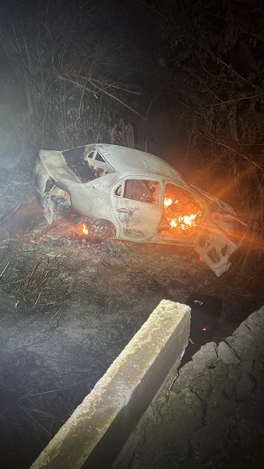 Para evitar a colisão, ela desviou o veículo, caiu da ponte e o carro acabou incendiando.