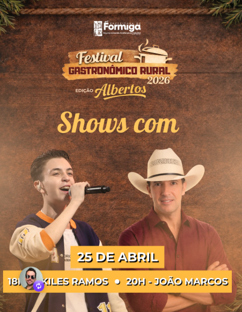 A Prefeitura de Formiga, por meio da Secretaria Municipal de Cultura, divulgou a programação oficial do Festival Gastronômico Rural – Edição Albertos. O evento, que busca valorizar a cultura local e as tradições do campo, reunirá gastronomia típica, apresentações musicais e atividades religiosas e recreativas para toda a família.