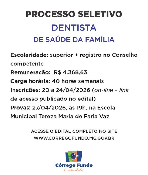 A Prefeitura de Córrego Fundo, por meio da Secretaria Municipal de Saúde, tornou público o Edital nº 001/2026, que abre inscrições para o Processo Seletivo Simplificado destinado à contratação temporária de Dentista da Saúde da Família.