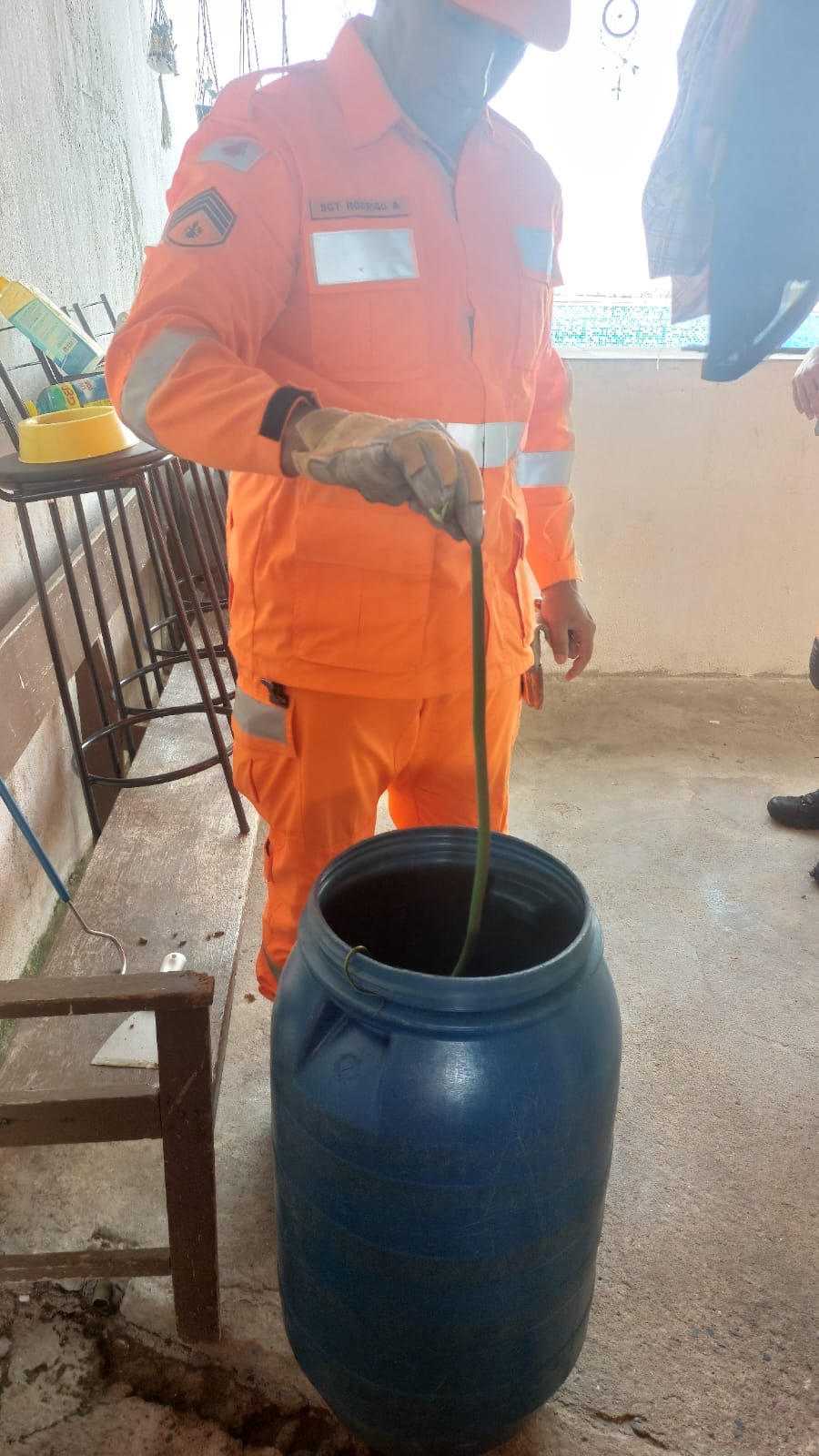 Uma serpente foi capturada na varanda de uma residência no bairro Tino Pereira, em Formiga, na manhã desta sexta-feira (3). O animal, da espécie Chironius exoletus, conhecida popularmente como cobra-cipó, foi localizado entre móveis do imóvel, mobilizando atendimento especializado.