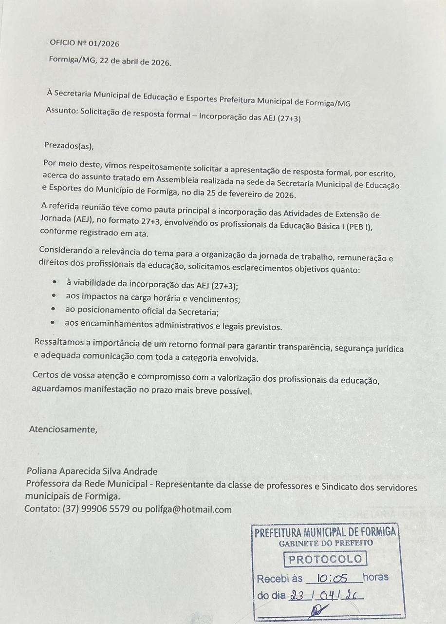 O Sindicato dos Servidores Municipais de Formiga (Sintramfor), em conjunto com representantes da categoria do magistério, protocolou nesta quinta-feira (23) um ofício ao prefeito Laércio Gomes solicitando posicionamento oficial sobre a incorporação das Atividades de Extensão de Jornada (AEJ), no formato 24+3, à jornada dos profissionais da Educação Básica I (PEB I). Click aqui para ver o documento.