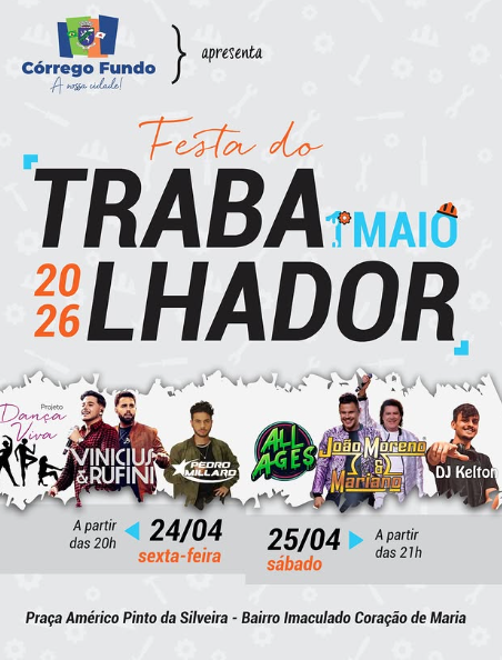 A Prefeitura de Córrego Fundo realizará, nos dias 24 e 25 de abril, a tradicional Festa do Trabalhador, com programação musical e cultural na Praça Américo Pinto da Silveira, no bairro Imaculado Coração de Maria. A celebração homenageia a força e a dedicação da classe trabalhadora do município.
