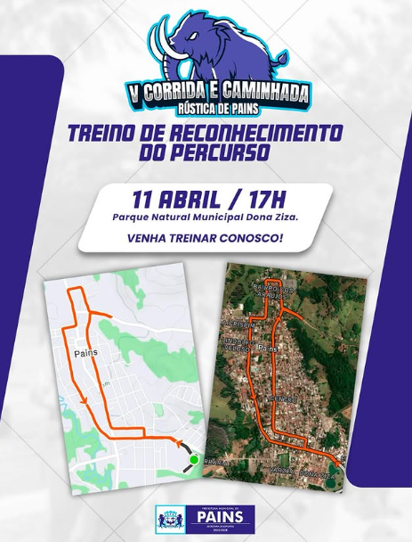 A cidade de Pains se prepara para mais uma importante etapa da V Corrida e Caminhada Rústica, com a realização do treino de reconhecimento do percurso, marcado para o dia 11 de abril, às 17h, no Parque Natural Municipal Dona Ziza.